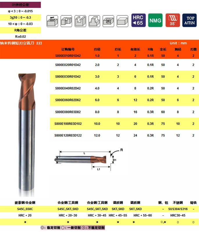 “纳米钨钢短刃立铣刀 2刃”的详细信息