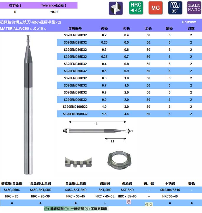 S-500极细微粒钨钢立铣刀